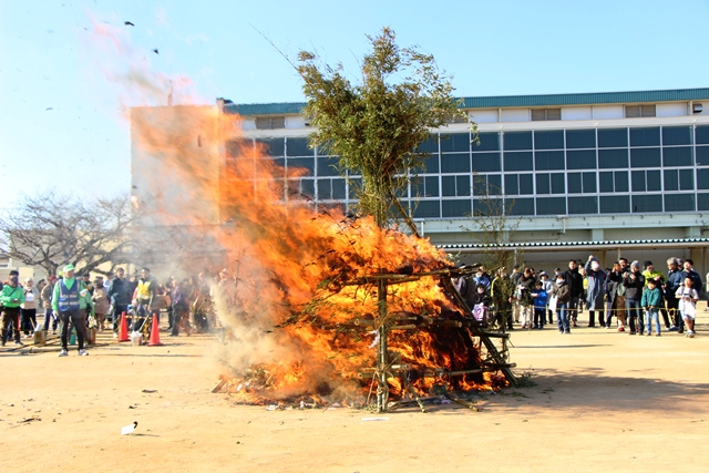 とんどは、青竹で組んだ高さ5mほどのやぐらにわら束を入れて、しめ飾りを持ち寄りとんどの中に入れ、焚き上げました。炎が盛大に上がって歓声が上がりました。